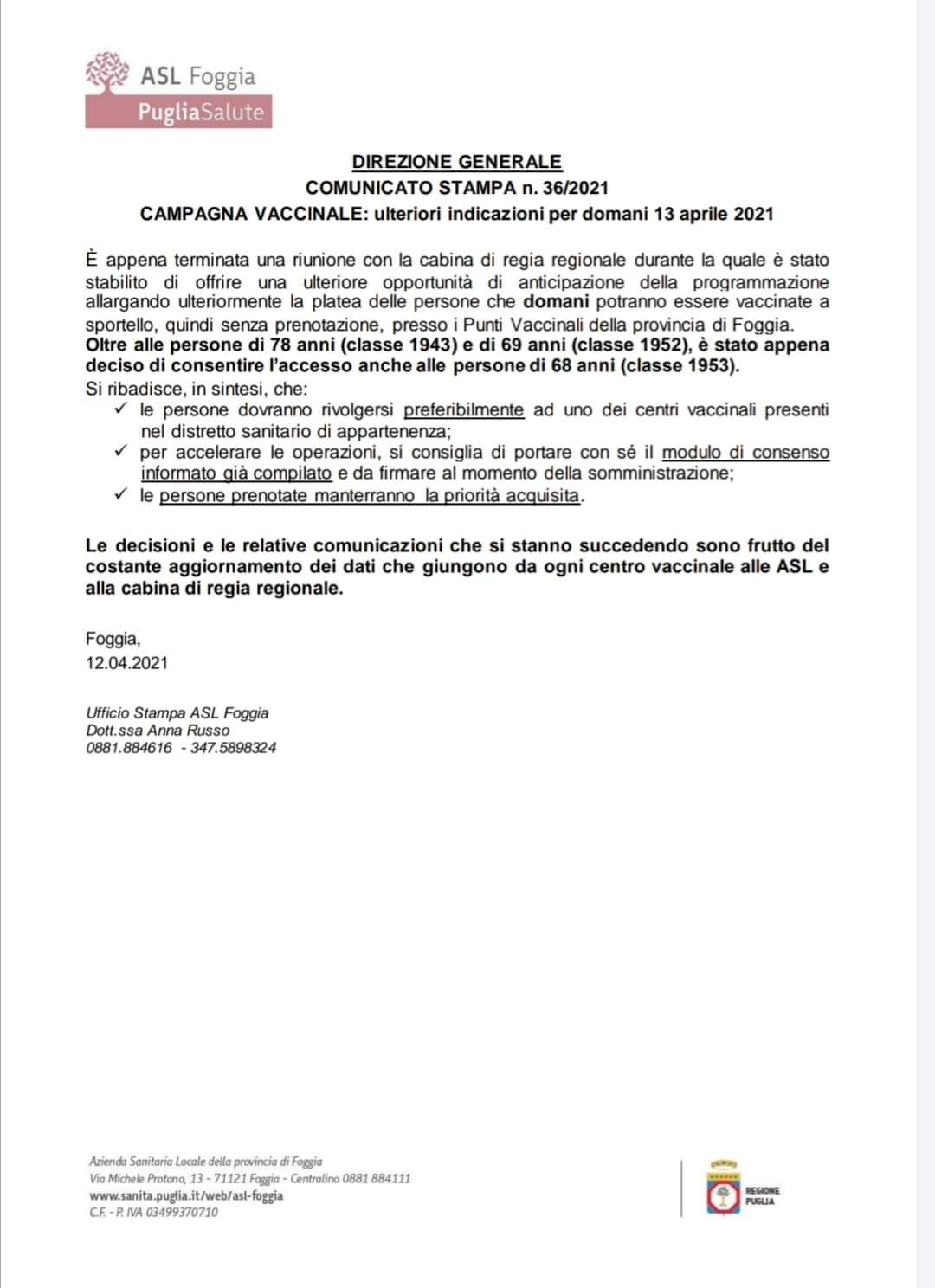 Si pubblica in allegato, il comunicato stampa dell'ASL Foggia in aggiornamento alle vaccinazioni anti Covid-19 del 13 aprile 2021